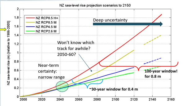 According to the Ministry for the Environment. the current track is the RCP 8.5 scenario in which a sea level rise of 0.41m by 2065 and 1.06m by 2120 is a likely outcome for New Zealand. If emissions increase at faster rates, a sea level rise is likely to be greater than these predictions.
